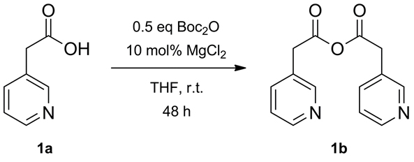 We used 3-pyridylacetic acid as the starting material since there was no 3-pyridylacetyl halide commercially available. At first, we synthesized 3-pyridylacetic anhydride 1b based on the reaction of 3-pyridylacetic acid 1a with di-tert-butyl dicarbonate in the presence of catalytic amounts of anhydrous magnesium chloride [11] (Scheme 1). Tetrahydrofuran was chosen as the solvent to maximize the product yield by minimizing the possibility of ester formation. As the reaction time elapsed, the mixture was then filtered and the crude product was washed successively with THF to remove soluble by-products (e.g., alcohol) that might have a negative impact on the second step of this process.