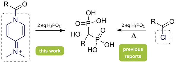 Prompted by the similarity of the chemical structure of the intermediate and an acyl chloride used in the typical α-hydroxy-1,1-bisphosphonic acid synthesis, we explored the effects of the nucleophilic substitution on the intermediate with phosphorous acid. In view of the fact that DMAP adds to an acyl group to form a much better leaving group than any of the halogens, and that phosphorous acid is a stronger nucleophile than alcohol, we assumed that no heat was necessary for this process to occur. As a result, we allowed the reaction to reach completion at room temperature. The use of cheap and widely accessible phosphorous acid made it possible to afford the expected product in 76%.