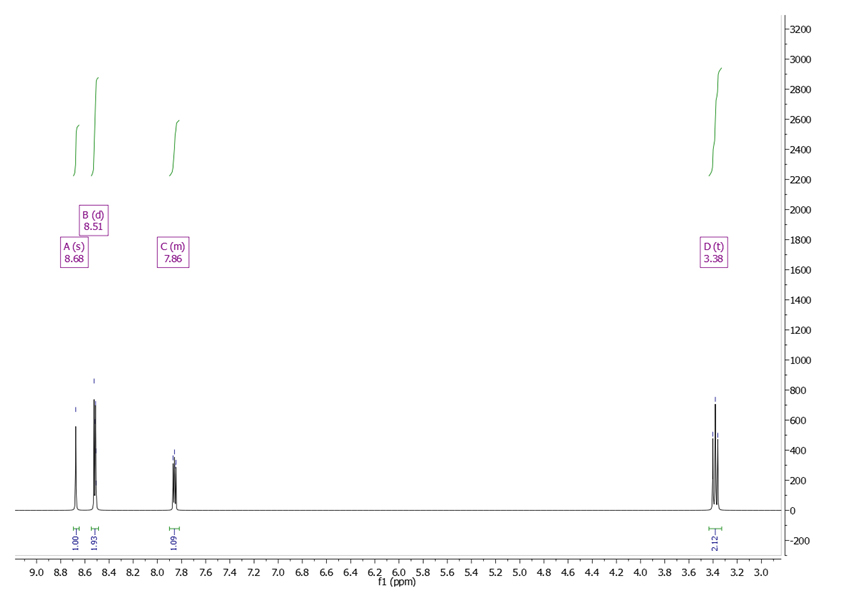 1-Hydroxy-2-(3-pyridyl)ethylidene bisphosphonic acid (risedronic acid) [15,17]. Obtained as white powder in 76% yield; m.p.: 225-2280C, HPLC purity: ≥99.9%. FTIR (KBr, cm-1) 3379, 309, 2149, 2035, 1637, 1566, 1475, 1446, 1396, 1332, 1213, 1072, 1026, 933, 889, 815, 800, 692, 667, 628, 607, 563, 532. 1H NMR (400 MHz; D2O; Me4Si) δ 8.68 (s, 1H), 8.51 (d, J=7.7 Hz, 2H), 7.86 (m, 1H), 3.38 (t, J=12.1 Hz, 2H). 31P NMR (600 MHz; D2O) δ 16.28. HRMS m/z 284.3 ([M+H]+, 100%; calculated: 284.12)