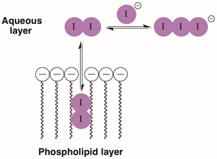 Iodine is a useful topical antiseptic due in part to its ability to dissolve in both hydrophobic and hydrophilic media. It has broad spectrum antimicrobial activity and its ability to readily pass through cell membranes plays an important role [1]. Iodine is also a useful catalyst in carbohydrate chemistry for a range of transformations [2]. Using it in such a capacity certainly makes traditional synthetic chemistry more colorful, as solutions of iodine are intensely colored, ranging from blue to violet to deep red depending on the solvent and other solutes. Iodine can be readily converted to colorless iodide solutions by the addition of sodium thiosulfate or sodium metabisulfite. Because iodine can pass between an organic/aqueous interface (Figure 1), this property offers an obvious visual demonstration of membrane permeability that is related to the distribution of molecules in living organisms. This simple protocol can be carried out using readily available household chemicals.
