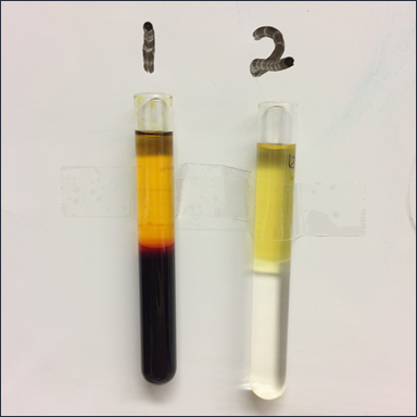 Fig 2. Iodine solution partitioned between water and ethyl acetate either (1) before or (2) after addition of sodium metabisulfite.