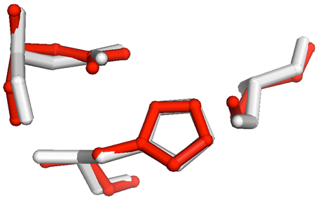 The RMSD for the all atom alignment for the three active site residues (aspartate 263 in 1TAH/aspartate 188 in 3DS8; histidine 285/histidine 222; serine 87/serine 102) was 0.42 Å . |