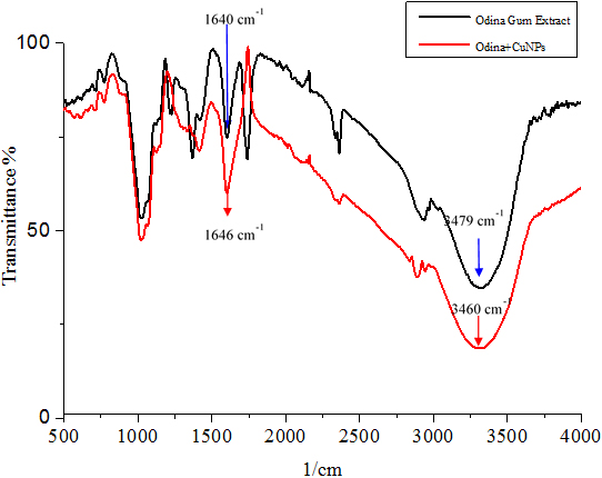 The FTIR estimation of plant concentrate and copper nanoparticles are provided in Figure 2, a-Odina Gum extract and b-Odina Gum +CuNPs. The FTIR examination was utilized to distinguish between the Odina woider gum and CuNPs. In Figure 2 (a), Odina woider gum separation demonstrated top peaks at 3851, 3479 and 1640 cm-1. The top absorbance at 1640 cm-1 was expected to agree with C=O stretching [31], the peak of 3479 cm-1 for O-H stretching of phenolic compounds [32]. The O-H stretching of hydroxyl groups absorbs at 3851 cm-1 [33]. In Figure 2 for copper nanoparticles, absorbance at 3901, 3840, 3852, 3460, and 1636 cm-1 were observed. Peaks at 1636 and 3460 cm-1 corresponded to C=O stretching of amides and O-H stretching of a phenolic compound, respectively. Alternate peaks seen in the copper nanoparticle spectra are 3852, 3840, and 3901 cm-1 due to O-H stretching alcohols and phenols [1]. The FTIR examination of CuNPs recommended that they might be encompassed by natural particles (e.g., polyphenols, alkaloids, and terpenoids); Kalainila et al. reported similar results [37]. The substance constituents display in plant leaves concentrate; for example, flavonoids, alkaloids, and unsaturated fats are in charge of reducing copper particles to copper nanoparticles because of their capping and limit reducing abilities.