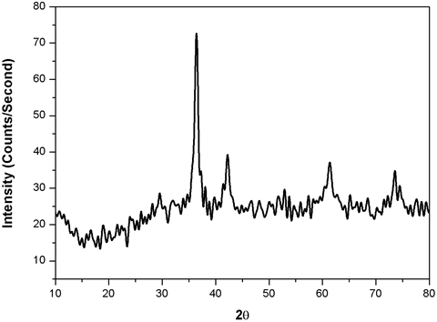 The crystal structure and size of the nanoparticles are verified by XRD analysis. Peaks observed at 2θ with values of 42.47, 51.73, and 73.42 correspond to (111), (200), and (220) planes of metallic Cu. These three peaks are quite consistent with those of the standard JCPDS Card No. 04-0836 for the standard spectrum of the pure FCC, face centered cubic, metallic Cu. Besides the metallic Cu peaks, several other diffraction peaks appeared at 36.43, 61.58, 73.42, and 77.19 corresponding to (111), (220), (311), and (222) planes of cuprite, respectively, indicating the formation of cubic copper (I) oxide nanocrystals. XRD peaks observed for cuprite is matched well with the standard powder diffraction card of bcc (body centered cubic) cuprite (JCPDS No. 05-667). The mean size of the crystalline Cu and Cu2O nanoparticles calculated from the major diffractions peaks using the Scherrer formula is about 28.73 and 25.19 nm, respectively.