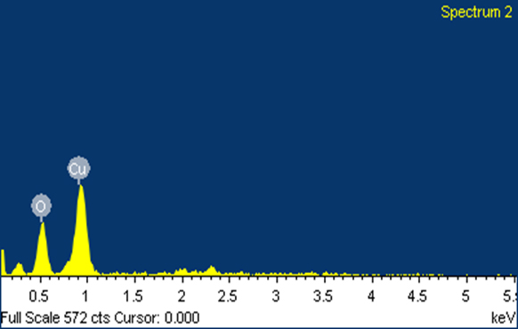 The EDX spectrum confirms the formation of biosynthesized copper nanoparticles, while Figure 4 (c) and Table 1 confirm the composition of synthesized copper nanoparticles.