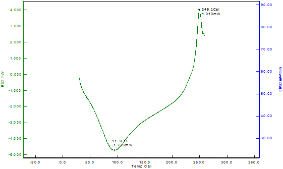 The thermal stability of the copper nanoparticles was explained by differential scanning calorimetry of copper nanoparticles shown in Figure 6. The DSC analysis gives the glass transition temperature which is defined as the peak temperatures in the heating curve. The DSC curve indicates that the copper nanoparticles reach the first exothermic peak at 249.10C, beginning at 94.30C; this is due to the oxidation of copper into cuprous oxide.