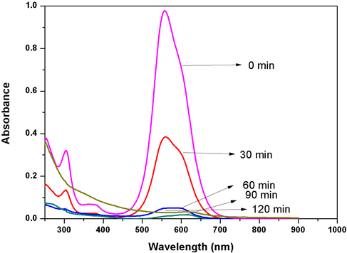 The photocatalytic activity of the green synthesized copper nanoparticles was evaluated by using the aqueous solution of an acid blue dye. It was performed by the addition of CuNPs to 10 ml of the dye solution, and the suspension was subjected to irradiation under sunlight. The aqueous suspension was magnetically stirred throughout the experiment. At different time intervals an aliquot was removed, the absorption spectra was recorded, and the rate of decolourization was determined in terms of change in intensity at λmax of the dyes. The decolourization efficiency % has been calculated as
