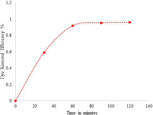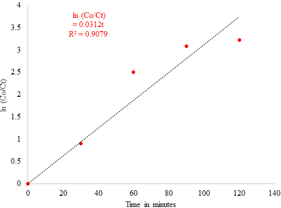 Figure 10 confirms a linear relationship between ln (Co/Ct) and irradiation time with a 3.12 x 10-2 min-1 rate of reaction. Thus, it confirmed that green synthesised CuNPs can be a potential photocatalyst for the effective removal of Acid Blue 120 dyes in the wastewater.