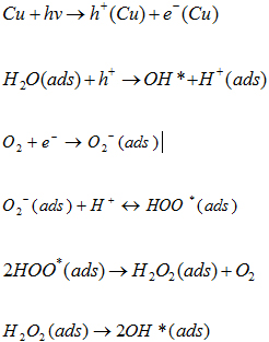 The photocatalytic mechanism of CuNPs consists of two main parts. The first part of a photochemical reaction is based upon the interaction with light associated with photon absorption, charge creation, dynamics, and surface trapping. The second part of the reaction is controlled by surface reactivity and surface radical formation, such as the formation of H2O, O2, and Organic Pollutants [41]. The Photocatalytic mechanism of CuNPs can be summarised as below: