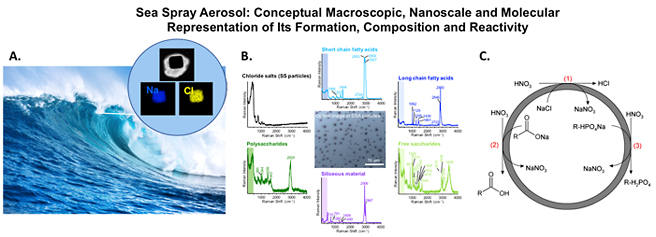Fig 1. Sea spray aerosol, produced from wave action and bubble bursting at the ocean-atmosphere interface, is composed of salts, organic compounds and biological components. Understanding the physical chemistry of sea spray aerosol requires a single particle analysis approach using different microscopic and spectroscopic probes to unravel the nanoscale and molecular representation of the composition and reactivity. A. Electron micrograph identifying with energy dispersive electron spectroscopy the inorganic core of a sea spray aerosol particle with an organic outer coating; B. Raman spectroscopy identifying organic and biological components of sea spray aerosol and; C. Reactivity studies of sea spray aerosol identify new reaction pathways with nitric acid and sea spray aerosol due to the various functional groups within different components of sea spray aerosol. |