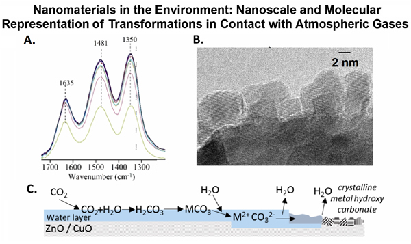 Figure 2A shows the results from spectroscopy of CuO nanoparticle surfaces in the presence of carbon dioxide and water vapor at environmentally relevant concentrations. These spectra were recorded as a function of time. It can be clearly seen there is adsorbed water (1635 cm-1 band due to the water bending mode) and carbonate ions (1481 and 1350 cm-1, due to the splitting of the asymmetric stretch), which are water solvated [9], on the surface of these nanoparticles. The surface reaction of CuO with these atmospheric gases is irreversible and transmission electron microscopy reveals the presence of small crystallites identified as copper hydroxy carbonates which form on the particle surface (Figure 2B). Similar reactions occur for ZnO nanoparticle surfaces when exposed to CO2 and H2O. The formation of these metal hydroxy carbonates occurs only when nanoparticles are exposed simultaneously to CO2 and H2O as shown in the mechanism depicted in Figure 2C.
