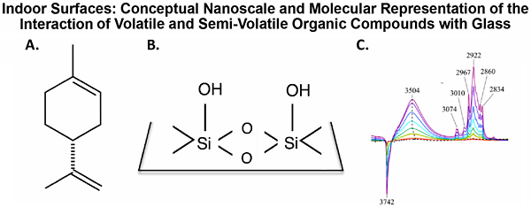 Fig 3. Infrared spectroscopy is being used to better understand the kinetics and thermodynamics of the adsorption of organic compounds on indoor surfaces. (A) Limonene and (B) SiO2, glass - a common surface found in indoor environments can interact as shown in (C) the infrared spectra as a function of increasing limonene pressure. |