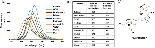 1% DMSO. (b) Positive solvatochromism of fluorophore 1 with polarity of solvents.