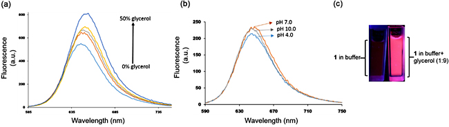 Figure 2a shows the effect of the addition of a highly viscous solvent (glycerol, viscosity 950 cP at 25oC) to the fluorescence intensity of the 1. It showed a broad emission in methanol centered at ~ 645 nm. But, when 10% glycerol was added an increase in intensity was noticed along with the slight bathochromic shift of the peak. As the amount of glycerol was gradually increased ̶ and thus the viscosity of the mixture ̶ enhancement of emission intensity was noticed. At 50% methanol/glycerol mixture (v: v) an almost two times increase in intensity was recorded. Figure 2c shows the solution of 1 in phosphate buffer and in 9:1 glycerol-buffer (v: v) mixture under UV light. In the latter case, the strong bright red fluorescence of 1 was visible to the naked eyes. Thus both these experiments demonstrate the strong environment effect on the fluorescence of 1. A heavily viscous microenvironment hinders rotation of the bonds and other local motions, impeding non-radiative decay of the excited state energy.