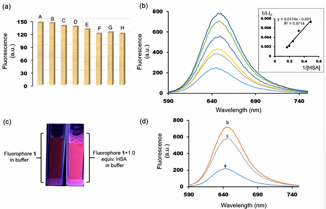Abstract: In this work, the efficacy of a donor-acceptor based red light emitting fluorophore has been assessed for human serum albumin (HSA) detection in aqueous samples. Due to intramolecular charge transfer (ICT) within an extended π-conjugated framework and the positive solvatochromic property, the fluorophore emitted in the far-red region of the electromagnetic spectrum in aqueous buffer samples. The fluorescence intensity was highly sensitive to the microenvironment, which resulted strong turn-on fluorescence response upon encapsulation of the fluorophore within the HSA. The signal was quantitative to the amount of fluorophore-protein complex in the experimental concentration range. The strong association affinity of the fluorophore toward HSA was attributed to the van der Waals and hydrophobic interactions. Such a spontaneous supramolecular association and the subsequent turn-on fluorescence response has potential for medical diagnostic applications.