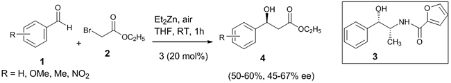 A chiral amide ligand 3 was developed from (1S, 2R)-(+)-norephedrine and 2-furoic acid and applied in Reformatsky reaction which enhanced the enantioselectivity of the product. The asymmetric Reformatsky reaction was carried out between various substituted benzaldehydes 1 and α-bromomethyl acetate 2 in presence of chiral ligand 3 (10-30 mol%) mediated by Et2Zn, which gave the corresponding β-hydroxy ester 4 in 50-60% yield and 45-67% ee (enantiomeric excess) (Scheme 2) [19]. Benzaldehydes with electron withdrawing group gave the product with good yield and enantioselectivity.