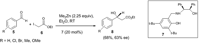 A novel chiral tridentate β-amino alcohols 7 synthesized from a mixture of 2,5-di-tertbutyl salicylaldehyde and chiral (1R, 2S)-2-amino-1,2-diphenylmethanol was used as a catalyst for the asymmetric Reformatsky reaction [20]. Here, the reaction was carried out with variously substituted aldehydes 5 and ethyl iodoacetate 6 to obtain good enantioselectivity of the desired product 8 (Scheme 3). Both electron withdrawing and electron donating groups attached to the benzaldehyde gave enantioselectivity in the range 60-63% ee. It was found that 1-naphthaldehyde and 2-naphthaldehyde gave the best enantioselectivity with 81% and 80% ee, respectively.