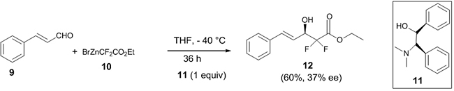 Wu et al. performed an asymmetric Reformatsky reaction between Cinnamaldehyde 9 and ethylbromodifluoroacetate 10 in the presence of the chiral ligand (1S, 2R)-N,N-dimethyl-2-amino-1,2-diphenylmethanol 11 to afford the desired product 12 in 37% ee (Scheme 4) [21].