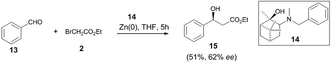 Morita et al. utilized the tertiary amino alcohol 14 obtained from α-pinene as a ligand for the asymmetric Reformatsky reaction between benzaldehyde 13 and 2-bromoethylacetate 2, which yielded the corresponding β-hydroxy ester 15 in 51% yield and 62% ee (Scheme 5) [22].