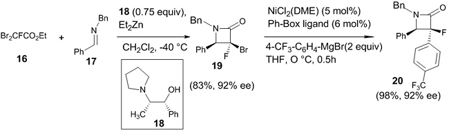 In 2014, Ando et. al. reported the asymmetric Reformatsky reaction of dibromofluoroacetate 16 with imine 17 using stoichiometric amount of ligand 18 (1R,2S)1-phenyl-2-(1-pyrrolidinyl) propan-1-ol (0.75 equiv) in Et2Zn (3.5 equiv.) at -40° C producing α-bromo-α-fluoro β-lactam 19 with 83% yield and 92% ee (Scheme 6) [23]. The synthetic utility of the reaction was demonstrated by the aryl functionalization of 19 to α-aryl-α-fluoro-β-lactam 20 without any reduction in the optical purity.