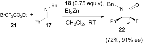 In the same year, Ando and co-workers also investigated a similar synthetic approach for the formation of α,α-difluoro-β-lactam from bromodifluoroacetate 21 with the same imine 17 and catalyst 18 at room temperature, which gave 22 in moderate yield (72%) and good enantioselectivity (91% ee) (Scheme 7) [24]. Imines which contain an electron withdrawing group as substituent in the aromatic ring, gave the corresponding products with high enantioselectivity in the range (94-99% ee) and moderate yield (45-74%), whereas electron donating group exhibited lower enantioselectivity (86-90% ee).