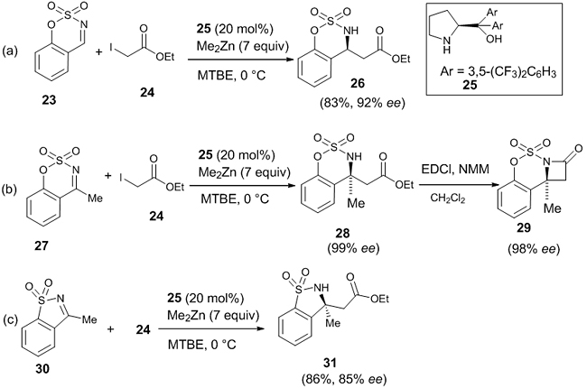 They also reported the enantioselective aza-Reformatsky reaction between cyclic ketimines like 4-methyl-benzo[e][1,2,3] oxathiazine-2,2-dioxide 27 and ethyliodoacetate 24 with the same ligand 25 and reaction condition as in aldimines [Scheme 8(b)]. The chiral β-amino ester 28 thus formed bears a quaternary stereocentre with excellent enantioselectivity (99% ee). Even when the amount of the ligand was reduced to 10 mol%, the enantioselectivity was 97% ee. The chiral β-amino ester can be used for the synthesis of β-lactam 29 without any reduction in the optical purity (98% ee). The reaction was extended successfully in the synthesis of chiral β-amino ester 31 (86%, 85% ee) from the five-membered cyclic N-sulfonyl ketimine 30 under the same reaction conditions [Scheme 8(c)].