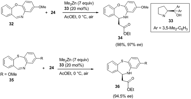 Very recently, De Munck et al. published the enantioselective Reformatsky reaction between seven-membered cyclic imine like dibenzo [b, f] [1,4] oxazepine 32 and ethyliodoacetate 24 in the presence of ligand 33 (20 mol %) in Me2Zn and air, and the corresponding β-amino ester 34 was obtained in 98% yield and 97% ee [26]. They also conducted similar Reformatsky reaction between dibenzo[b,f][1,4] thiazepine 35 and 24, affording β-amino ester 36 in 95% yield and 94.5% ee (Scheme 9).
