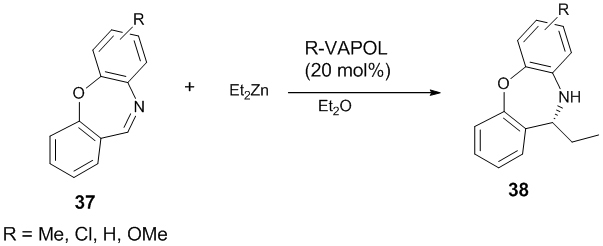 Later on, De Munck et al. extended their work and disclosed the first enantioselective addition of Et2Zn to cyclic imines 37 in presence of (R)-VAPOL-Zn (II) complex as the catalyst [27]. The product 38 was obtained with moderate enantioselectivity (up to 70% ee) and good yield (up to 76%) (Scheme 10).