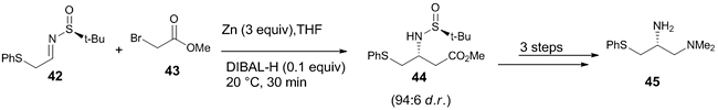 Laclef et al. reported a diastereoselective aza-Reformatsky reaction for the synthesis of the key fragment diamine present in anti-apoptotic Bcl-2/Bcl-XL protein inhibitors, used in anticancer therapy [29]. They performed a large-scale synthesis of the diamine with fewer purification processes. The Reformatsky reaction between sulfinimine 42 and excess of methylbromoacetate 43, afforded the corresponding product 44 with a high diastereomeric ratio (>94:6) which was further transformed to give the diamine fragment 45 with 95% HPLC purity (Scheme 12).