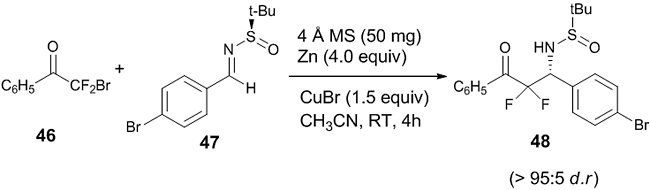 An asymmetric Reformatsky reaction between bromodifluoromethyl phenyl ketone 46 and various substituted chiral ketimines 47 in presence of 4 Å molecular sieves (MS) was reported (Scheme 13) [30]. Both electron withdrawing and electron donating groups on the chiral ketimine afforded the product 48 with excellent diastereoselectivity (>95:5 d.r.) which has many synthetic applications.