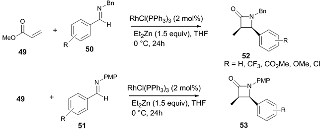 Rhodium enolate based Reformatsky reaction in presence of Wilkinson catalyst and Zn has also been developed [31]. Here, the reaction was conducted on α,β-unsaturated esters 49 and various imines like N-benzyl substituted imines 50 and N-para-methoxy phenyl imines 51 resulting in syn β-lactam 52 and 53 as the products (Scheme 14). Both electron withdrawing and electron donating groups in the benzene ring produced the syn β-lactams in better yields. This method can be used for the one-pot synthesis of spiro β-lactams from ketimines.