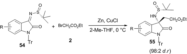 A highly efficient diastereoselective asymmetric Reformatsky reaction between isatin-derived chiral N-sulfinyl ketimines 54 and ethyl bromoacetate 2 in presence of the solvent 2-methyltetrahydrofuran and mediated by Zn-CuCl has been developed in which optically pure 2-oxoindolinyl β3,3-amino acid ester 55 was obtained with excellent diastereoselectivity (98:2 d.r) (Scheme 15) [32]. The reaction was performed with different ketimines and concluded that both electrons withdrawing and electron donating groups in the benzene ring of the ketimine gave rise to better yield and excellent diastereoselectivity. The β-amino acid so obtained was used for the synthesis of gastrin/cholecytokinin-B receptor antagonist AG-041R.