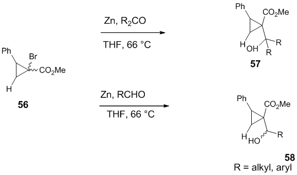 Nishii et al. developed a Reformatsky reaction between α-bromocyclopropanecarboxylate 56 and ketones, in presence of zinc affording trans adducts 57