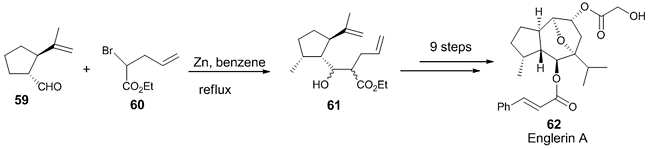 A short synthetic route for the natural product, (-)-Englerin A (active against renal cancer cell lines) 62 was reported with 12 steps in 16% yield [37]. The first step in the construction of the hydroazulene framework was a zinc-mediated reaction between photocitral A 59 and bromoester 60 under mild conditions, affording the product 61 in good yield as a diastereomeric mixture (Scheme 17).