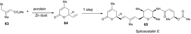 Ghosh et al. performed zinc-mediated reaction for the formation of racemic dihydropyranone from methyl-3-bromomethylcrotonate 63 and acrolein as one of the steps in the synthesis of Spliceostatin E 65, which has potent antitumor activity (Scheme 18) [38]. The racemic mixture was resolved by chiral HPLC and the (S)-dihydropyranone 64 was used for the synthesis.