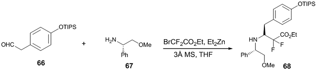The synthesis of Tyr1-Ψ [(Z) CF=CH]-Gly2 Leu-enkephalin fluorinated peptidomimetics have been reported using Reformatsky reaction [39]. In the key step, fluorine was incorporated through a diastereoselective Reformatsky-Honda reaction between TIPS protected phenyl acetaldehyde 66 and chiral amine 67 using molecular sieves, and the desired product 68 was obtained in good yield (Scheme 19).