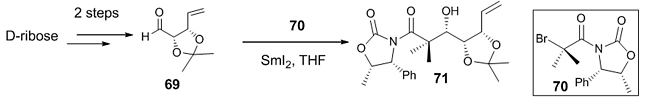 The key step for the synthesis of the eastern fragment of PI-3- a jatrophane diterpene used in the treatment of cancerous conditions, swellings and warts was a diastereoselective SmI2-mediated Reformatsky reaction [40]. Here, D-ribose was converted to an unsaturated aldehyde 69 which was further reacted with bromoacyl oxazolidinone 70 to afford the oxazolidinone product 71 as a single diastereomer with S-configured hydroxyl group (Scheme 20).