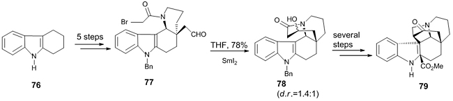 An indole alkaloid, Methyl N-decarbomethoxychanofruticosinate 79, used in the treatment of pharyngitis, tonsillitis, rheumatoid arthritis, etc., has been synthesized using Reformatsky reaction [42]. The commercially available 1, 2, 3, 4-tetrahydro-4-oxocarbazole 76 was transformed to aldehyde 77. In order to create a seven-membered ring, an intramolecular SmI2-mediated Reformatsky reaction was performed to give 78, which underwent several steps to afford the product as a mixture of two diastereomers in good yield (Scheme 22).