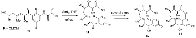 One of the key steps in the total synthesis of Ansamacrolactams (+)-Q-1047H-A-A 82 and (+)-Q-1047H-R-A 83 (class of macrolactam bacterial metabolites, used for the synthesis of some natural products) was the SmI2-mediated intramolecular Reformatsky reaction for the formation of macrolactam ring 81 from the intermediate 80 (Scheme 23) [43].