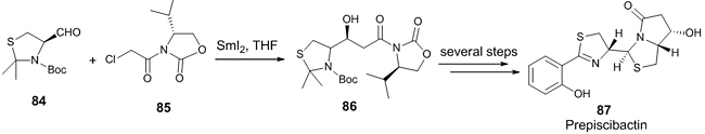 The first total synthesis of Prepiscibactin 87, the key intermediate for the biosynthesis of piscibactin (siderophore seen in bacterium Photobacterium damselae) was realized by SmI2-mediated Reformatsky reaction [44]. The key step in the synthesis was a SmI2-mediated Reformatsky reaction between thiazolidinic aldehyde 84 and α-chloroacetyl-2-oxazolidinone 85 affording the syn-selective product 86 with 99% d.r. (Scheme 24).