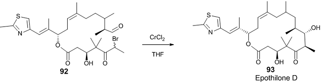 Chromium is rarely used in the Reformatsky reaction. A chromium-mediated Reformatsky reaction is a powerful tool for the formation of the asymmetric C-C bond due to its unusual stereospecificity and chemoselectivity in macroaldolization. In this reaction, when aldehydes are used as electrophiles, diastereoselective syn products are obtained whereas anti products are obtained with chiral auxiliaries. A chromium-mediated Reformatsky reaction was used in the total synthesis of Epothilone D 93 [46]. The required syn selective C6-C7 bond of this compound was prepared from the precursor 92 in presence of CrCl2. (Scheme 26).