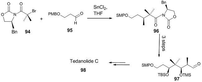 Tedanolide C was synthesized from oxazolidinone 94 with an aldehyde 95, by a tin-mediated Reformatsky reaction which gave rise to a product 96 with 56% yield and >98:2 d.r. (Scheme 27) [47].