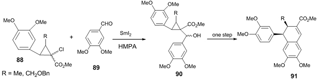 Nishii et al. reported the total synthesis of Cyclogalgravin and its dicarboxyl analog due to its biological importance such as antineoplastic cytotoxicity and apoptosis-inducing activities [45]. One of the key steps in this synthesis was a SmI2-mediated Reformatsky reaction between α-chloroester 88 and veratraldehyde 89. An excellent trans selective product 90 (trans/cis = 99/1) was obtained in good yields which on ring expansion gave Cyclogalgravin 91 (Scheme 25).