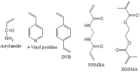 4-vinylpyridine, acrylamide, ethylene glycol dimethacrylate, N, N'-methylene-bis-acrylamide, and divinylbenzene were commercial products availed from Aldrich Chemical Company, USA. All low molecular weight compounds were commercially available samples and were purified by distillation under reduced pressure immediately before use or recrystallization unless otherwise stated. IR spectra were recorded on Shimdzu FT-IR-8400 S spectrophotometer. UV spectra were recorded on Shimdzu UV-2450 spectrophotometer. Melting points were measured using Buchi-530 melting point apparatus.
