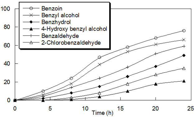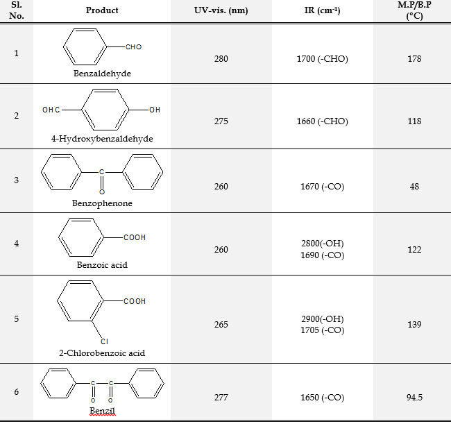 Five-fold molar excess of the reagent was added to benzoin (100 mg) in cyclohexane at room temperature (30ºC) and the extent of oxidation was followed by TLC. The same experiment was repeated at temperature 50ºC and refluxing temperature of the solvent.