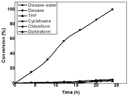 The oxidation reactions were investigated in solvents of different polarity like dioxane, tetrahydrofuran, chloroform, cyclohexane, dichloromethane and dioxane-water mixture (1:1). Because of the hydrophilic nature of the acrylamide, the reagent could not swell in any other solvent than dioxane: water mixture (1:1). Hence all oxidations were carried out in dioxane: water mixture.