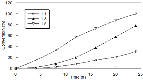 Oxidation of benzoin was carried out by varying the molar excess of poly[4-vinyl(pyridine-co-acrylamide)]-permanganate, keeping other experimental conditions the same. The oxidation reactions of 1 mmol of benzoin with a different molar excess of polymeric reagent are studied. With increasing substrate to reagent ratio, the extent of oxidation increased. The results are presented in Figure 5.
