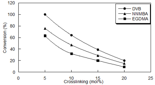 In order to investigate the oxidizing ability of permanganate functions supported on 5–20 mol% DVB-, NNMBA- and EGDMA-cross-linked poly[4-vinyl(pyridine-co-acrylamide)], oxidation of benzoin to benzil, was selected as a model reaction. As shown in Figure 7, in all cases the 5 mol% cross-linked system has high reactivity and decreased further with increasing crosslinking. The observation of the decrease of the rate of oxidation of functionalized polymer with an increase in crosslink density is due to the decreased availability of the reactive sites buried within the crosslinks. For an effective oxidation to occur, the functional group should be more accessible to the reagent in the solvent phase. As the degree of crosslinking increases, the availability of the reactive moiety decreases even in the presence of good solvents.