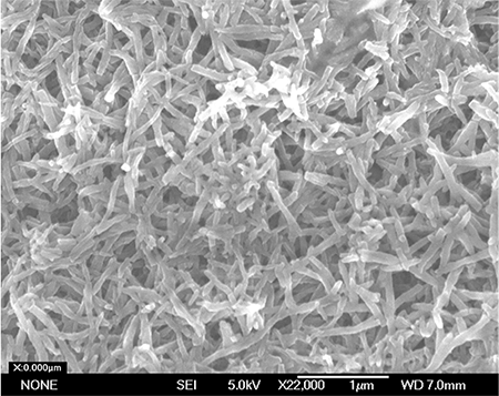 After discussing the problem with my research group, Jiaxing Huang (who is now a Professor of Materials Science and Engineering at Northwestern University) said that he would take care of this. Very quickly, Jiaxing developed a straightforward method to make nanostructured forms of polyaniline by using interfacial polymerization, an idea related to how Nylon is synthesized [2]. The ingredients for producing polyaniline are the aniline monomer combined with acid and oxidant, typically ammonium peroxydisulfate (APS). Mixing together all three ingredients produces a highly agglomerated form of polyaniline [3]. Jiaxing’s idea was to separate the aniline in an organic solvent from the acid and oxidant, which were dissolved in an aqueous solution. When one solution was placed on top of the other, the reaction kinetics were controlled by the interface, leading to nanofibers. In fact, Jiaxing demonstrated that when the acid was HCl, nanofibers formed with an average diameter of 30 nm and lengths on the order of microns [4,5,6]. Using camphor sulfonic acid produced polyaniline nanofibers with an average diameter of 50 nm, whereas perchloric acid created nanofibers with an average diameter of 120 nm, again with an average length on the order of microns. Note that polyaniline nanofibers had been previously produced by templated growth in zeolites [7] and anopore membranes [8]; however, removing these templates would be needed for applications such as sensors.
