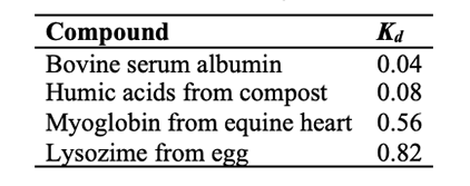 Figure 4 reports the chromatogram of compounds used for calibration. Hydroquinone was chosen as a model of low-molecular- weight humic acids [46]. Myoglobin, BSA and lysozime were chosen because of their sharply different isoelectric points (IP), with the aim to assess the effect of electrostatic interactions with the column. At the experimental pH (8.6), Myoglobin (IP = 7) and BSA (IP = 5) have a negative net charge whereas Lysozime (IP = 11) has a positive net charge. Figure 4 shows that the molar mass had a monotonic trend with the elution volumes, which suggests that column interactions played a negligible role.